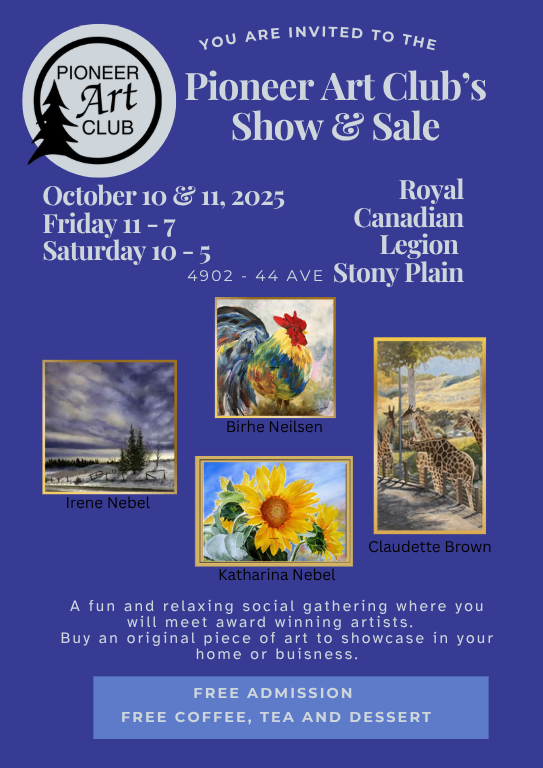 On October 10 and 11, 2025, the Pioneer Art Club will be hosting its 10th annual art show and sale at the Royal Canadian Legion in Stony Plain. This club consists of local artists, 55+ and of all skill levels, who meet twice a week to do art...